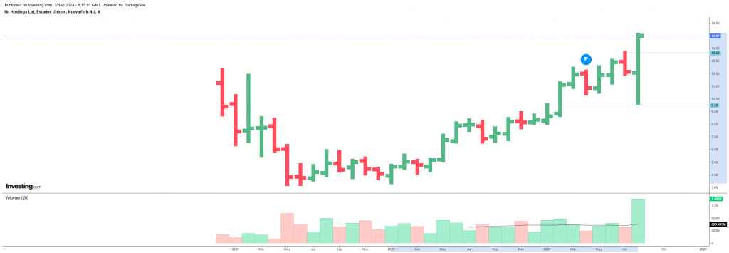 Acción que empezó a cotizar en 2021, dentro del sector tecnológico se dedican a la banca digital. Ha subido un 363% desde enero de 2023. En agosto 2024 ha roto máximos haciendo una envolvente en la gráfica mensual con una bajada hasta valores muy claros de soporte y resistencia de enero de 2024.